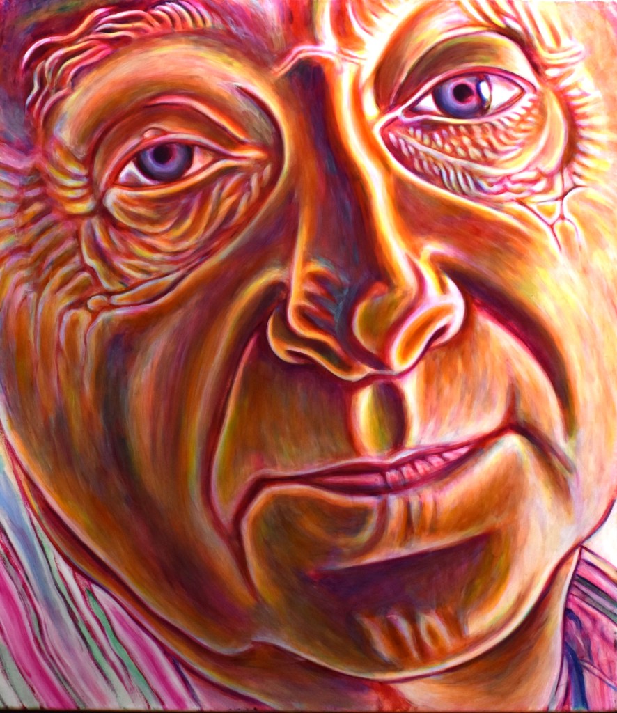I paint with one primary color at a time, each reduced to transparency in acrylic medium, with secondary colors mixing on the canvas, back to front. This results in a smooth waxy finish with a sense of surface depth. Foundations are studio-built.